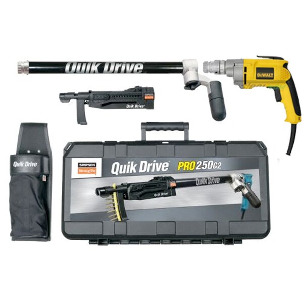QuikDrive PRO250G2D25K System w/ 120V DW 2500 RPM Motor This system is ideal for subfloor to wood or steel applications. It features expanded depth settings for appropriate countersink and a reversible and replaceable non-skid teeth attachment. Key Features Expanded depth settings for appropriate countersink in a variety of applications. Reversible replaceable non-skid teeth attachment. Uniform toenailing and countersink on slick surfaces. Non-skid teeth increase stability and provide uniform toenailing and countersink on slick surfaces. The patented curved collation strips U.S. Patent 7,051,875 hold the screws up and away from the work surface, making moving and positioning the tool easier. They are also pointed on the inserted end to simplify loading. Applications Fastening Wood-to-Wood Fastening Subfloor to Wood Truss-Ply Fastening Crating Sheathing Fastening Fiber-Cement Siding Subfloor to wood or steel Product Includes PRO250G2 subfloor attachment also sold separately Extension for stand-up driving Choice of DeWalt1/4 or Makita1/4 screwdriver motors Screw quiver for keeping screws at your fingertips Rugged tool case to protect your equipment on the jobsite Compatible Screws WSV SUBFLOOR Screw PPSD SHEATHING-TO-CFS Screw DSV WOOD Screw WSHL Subfloor Screw CBSDQ Sheathing-to-CFS Screw WSFLRV Wood-to-CFS/Aluminum Screw WSC Wood Screw Trim-Head Screw, Type-17 Point DWC Drywall Screw DWFSD Drywall-to-CFS Screw