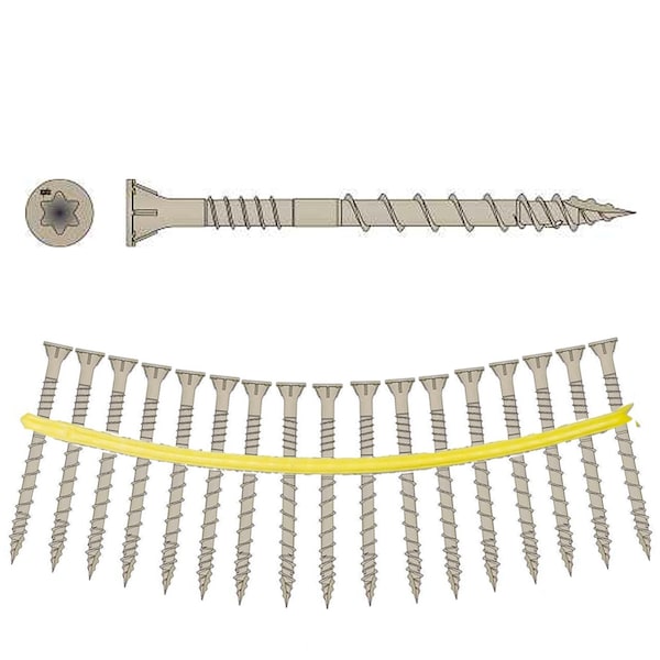 QuikDrive DSVT212S #10 x 2-1/2in T-25 Collated Decking Screw 1000ctThe Deck-Drive DSV Wood screw is a powerful fastening solution for preservative-treated decking applications. With its under-head nibs and fast-start tip, the DSV is ideally suited to be driven and countersunk into todayfts wood deck boards. The shank is designed to withstand the swelling and shrinkage that is common with fast-growth lumber. Available in hand-drive and in collated strips for use in our Quik Drive1/4 auto-feed screw driving system, DSV screws are also offered in a variety of sizes to fasten fascia and trim.Key FeaturesLow-torque threadsRibbed-head design countersinks easily and provides a clean, finished appearanceHigh-low threads with Type-17 point provides fast startsOptimized threads for lumberQuik Guard1/4 coating provides corrosion resistance for exterior and certain preservative-treated wood applicationsMeets the performance requirements of ICC-ES AC257 exposure conditions 1 and 3Colors to blend in with most woodsApplicationsPreservative-treated decking and exterior wood-to-wood applications Specifications: Coating/MaterialQuik Guard1/4 CoatingScrew Size#10Length in.2 1/2Drive TypeT25 6-LobeHead TypeRibbed Flat HeadThread TypeVariable Thread DesignPoint TypeHigh-Low Threaded TipColorTanCompatible ToolsQuik Drive1/4 PRO250G2, Quik Drive1/4 PRO300SG2Packaging Qty.1000