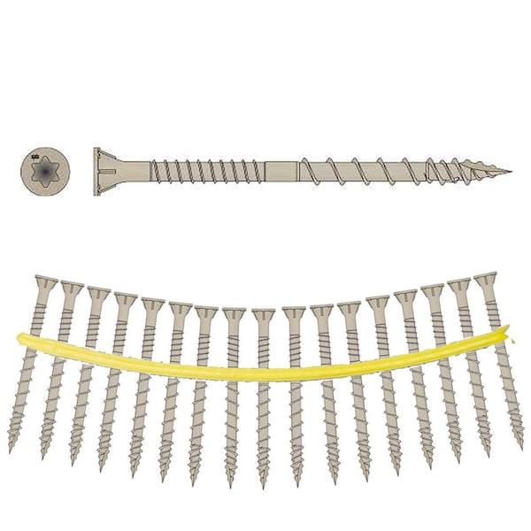 QuikDrive DSVT3S #10 x 3in T-25 Tan Collated Decking Screw 1000ctThe Deck-Drive DSV Wood screw is a powerful fastening solution for preservative-treated decking applications. With its under-head nibs and fast-start tip, the DSV is ideally suited to be driven and countersunk into todayfts wood deck boards. The shank is designed to withstand the swelling and shrinkage that is common with fast-growth lumber. Available in hand-drive and in collated strips for use in our Quik Drive1/4 auto-feed screw driving system, DSV screws are also offered in a variety of sizes to fasten fascia and trim.Key FeaturesLow-torque threadsRibbed-head design countersinks easily and provides a clean, finished appearanceHigh-low threads with Type-17 point provides fast startsOptimized threads for lumberQuik Guard1/4 coating provides corrosion resistance for exterior and certain preservative-treated wood applicationsMeets the performance requirements of ICC-ES AC257 exposure conditions 1 and 3Colors to blend in with most woodsApplicationsPreservative-treated decking and exterior wood-to-wood applications Specifications: Coating/MaterialQuik Guard1/4 CoatingScrew Size#10Length in.3Drive TypeT25 6-LobeHead TypeRibbed Flat HeadThread TypeVariable Thread DesignPoint TypeHigh-Low Threaded TipColorTanCompatible ToolsQuik Drive1/4 PRO300SG2Packaging Qty.1000