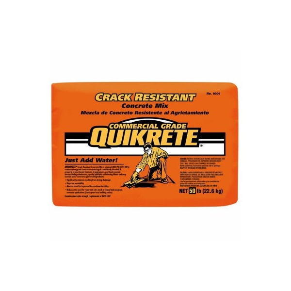 Quikrete, 50 lb, crack resistant concrete mix, commercial grade, with air entraining admixture, alkaliresistant reinforcing fibers throughout, formula reduces cracking from drying shrinkage, is designed for use in structural concrete applications, eliminates the need for wire mesh in typical slab on grade slabs, superior workability, finishing