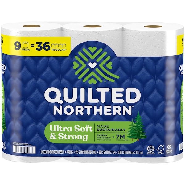Quilted Northern Ultra Soft and Strong Toilet Paper offers comfort strength and sustainability all in one toilet tissue pack. Each premium 2-ply sheet is 5X stronger and more durable than the leading value brand of toilet paper when wet -- all created using responsible manufacturing and sourcing practices. Our proprietary manufacturing technology is energy-efficient while providing the soft and strong toilet paper you expect. The trees used to create Quilted Northern toilet paper products come from well-managed FSC certified forests and other responsible sources. And to top it off two trees are planted for each tree used through our partnership with the Arbor Day Foundation. Each mega roll has 295 sheets so in total you are getting over 2 650 sheets of Quilted Northern Ultra Soft and Strong toilet paper. This large toilet paper pack contains 9 Mega Rolls of Quilted Northern Ultra Soft and Strong bath tissue equal to 36 Quilted Northern Regular Rolls so you can change the roll less often. Look no further for an unbeatable combination of softness strength and sustainability - choose Quilted Northern Ultra Soft and Strong toilet paper.