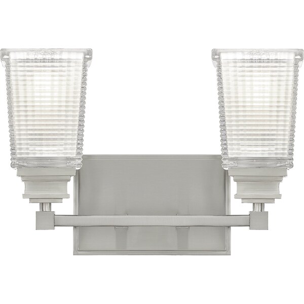 The transitional style of the Abbott collection is the perfect addition to any bathroom. Tiered cast fitters add just the right amount of detail. A Brushed Nickel finish with clear prismatic etched glass shades create a clean and simple fixture.