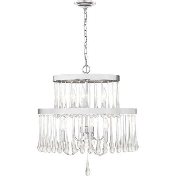 Evoking wind chimes with its fluid, organic shape, the Alva chandelier features clear crystal drops that refract and reflect light amid a high-shine, polished chrome finish. This design adds a quiet sense of glamour to a smaller space, such as a dressing room or bedroom.