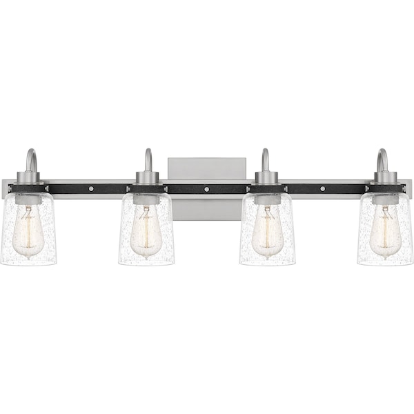A timeless Brushed Nickel finish and clear seeded glass shades are the highlight of the Axel collection. Available in many different sizes, these versatile bath lights are sure to elevate your bathroom and give you a spa-like experience. A simple silhouette and black industrial style accents give these light fixtures a unique flair, making these great additions to any transitional or farmhouse inspired room.
