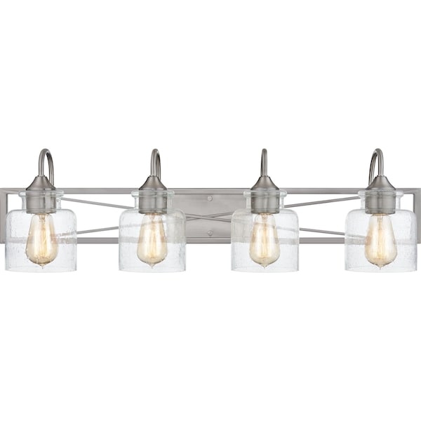 Orient the Bartley bath light up or down to customize — and maximize — illumination within a primary or guest bathroom. Available in the soft sheen of brushed nickel or the clean lines of matte black, this light features subtle architectural details. A seeded glass shade offers a touch of patina.