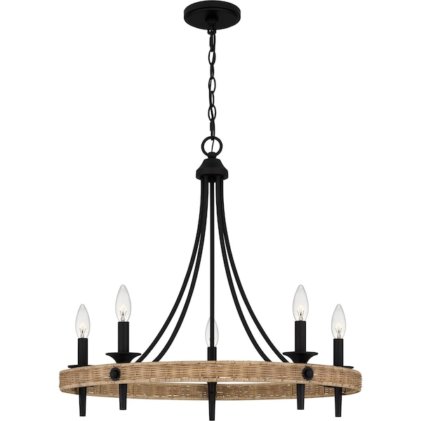 Part of the Quoizel Naturals collection, the Catania chandelier features natural elements and materials. The classic silhouette is accentuated by a matte black finish, slender candle sleeves and matching bobeches. A round ring made of rattan surrounds the exterior, adding depth and contrast to the otherwise simple black frame.