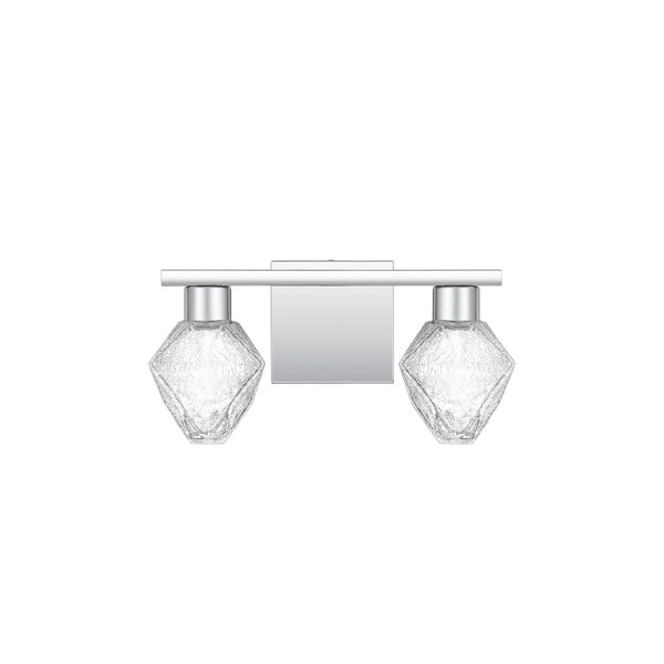 Faceted, crystalline glass bulbs feature integrated LED lights in the Chrysalis range, a glamorous series of vanity lighting in a polished chrome finish. The clear, crackled glass shades diffuse light beautifully, yet provide targeted overhead illumination to create a bright bathroom or entryway. A simple chrome backplate anchors the horizontal base, available in a variety of sizes.