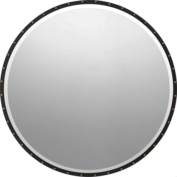 The Coliseum mirror offers an industrial twist on minimalist décor. Beveled glass is thinly framed in painted black steel, but a series of small brass rivets line the perimeter, providing a machine-engineered flourish.