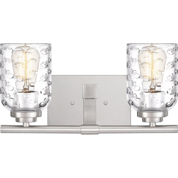 The Cristal features contemporary bubble cut glass set atop a sleek crossbar in classic brushed nickel. Tiered socket covers and a rectangular backplate complete the look.