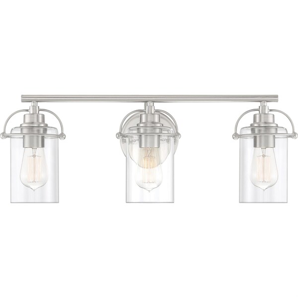 Emerson's transitional silhouette charms with unique harness-style brackets and simple clear glass shades in this bath vanity light. Finished in a classic brushed nickel, this collection is sure to complement any décor. Emerson can be installed with shades facing up or down - allowing you to customize to your desired space.