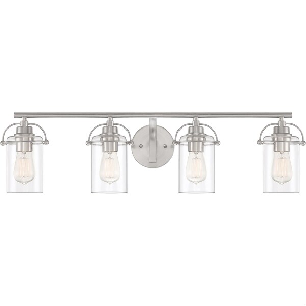 The Emerson's transitional silhouette charms with unique harness-style brackets and simple clear glass shades. Finished in a classic brushed nickel, this collection is sure to complement any décor.