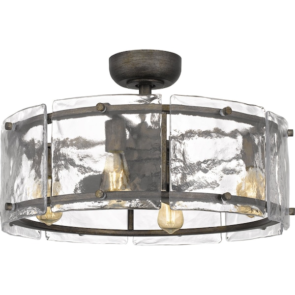 Panels of textured glass pair with an earth black finish to create the Fortress series. Offering simple yet striking design, Fortress is available as a mini pendant, semi-flush mount, pendant, or island light. As a fan light, this design comes in both earth black and mottled silver finishes.