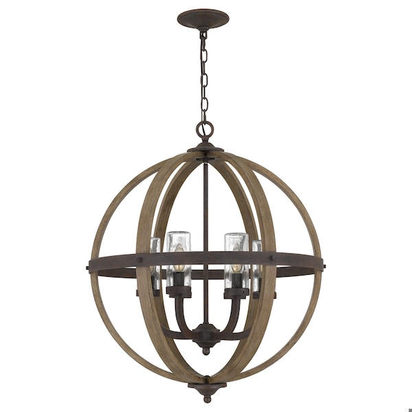 Aptly named, the Fusion pendant marries rustic and traditional designs to stunning effect. The stylized design takes inspiration from medieval lighting, yet with a modern overhaul made for today’s living. Safe to use inside or out, this piece features wood and steel elements to create patina while clear, seeded glass shades add a touch of levity and charm.