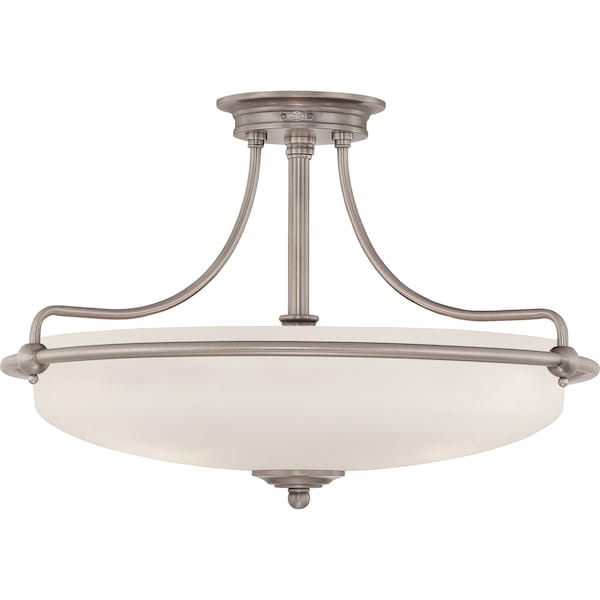 This understated style provides a stylish soft modern look for most any room. The etched shade is painted white inside diffusing the light evenly and illuminating your home with a soothing glow. It is held in place by softly curved arms and is available in three finishes: Antique Nickel Polished Chrome Palladian Bronze and Weathered Brass.
