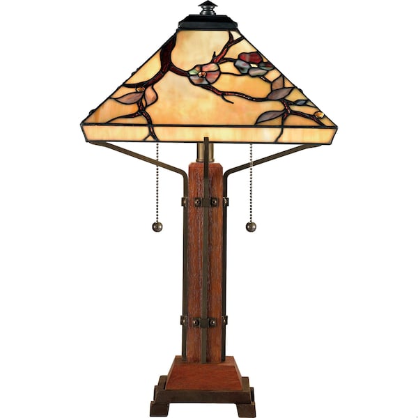 This Arts and Crafts piece features a shade with flowering tree pattern handcrafted from genuine art glass in hues of amber wine steel blue and hunter green. The wood base has geometric iron accents adding to its natural earthy organic style.