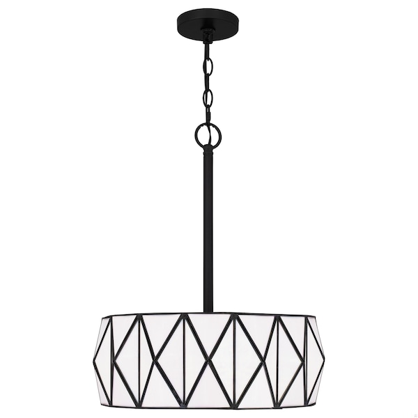 Geometric adornments cover a drum-shaped shade in the Jakarta light. Jakarta delivers a soft yet striking glow thanks to matte black framework. Hang this pendant in a contemporary dining space to illuminate modern design.