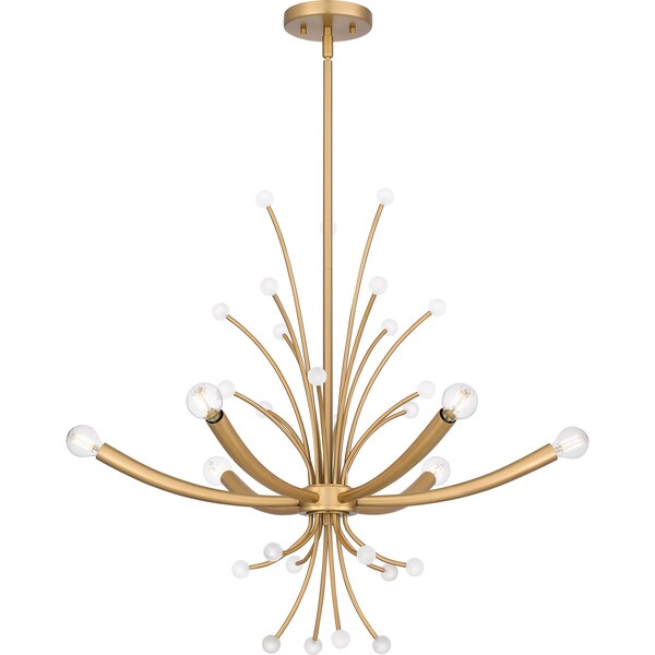 Kiera radiates on-trend, modern style. The captivating chandelier features a futuristic design with sleek, curving lines and small white spherical accents. Kiera is available in two beautiful finishes - choose brushed weathered brass for a slightly retro vibe or polished nickel for a timeless shine.