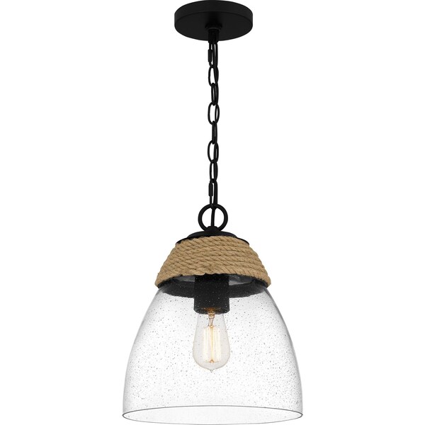 The Kingstide mini pendant evokes the feel of a seaside cottage. Featuring natural rope detailing and a clear seeded glass shade, this design hangs from a matte black chain. Use it anywhere you want to add comfortable, casual charm.
