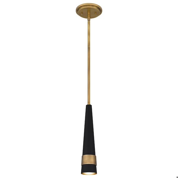 Meet the slim, sultry lines of Lennox. This black mini pendant includes integrated lighting for dependable, continuous illumination. A weathered brass finish provides a luminous glow.