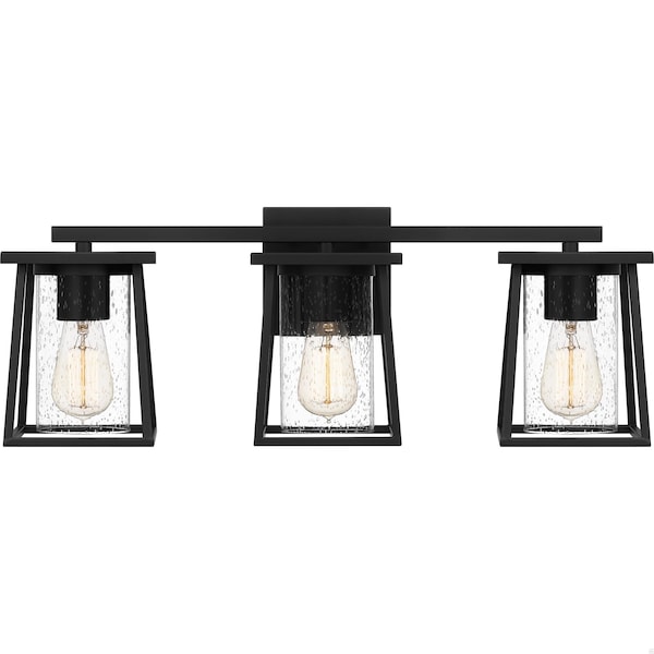 The Lodge collection offers a simplistic design with unique glass that makes a statement all on its own. Cylindrical clear seeded glass shades are showcased in a sleek, industrial styled Matte Black frame. Choose from the many size options in this collection to enhance your home bath decor.