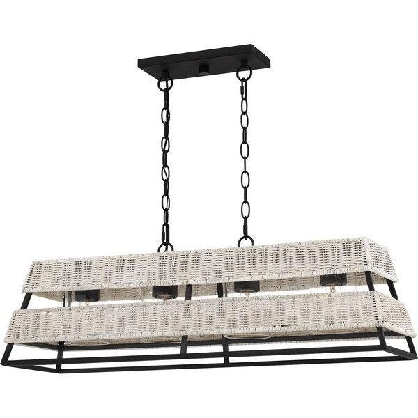 The Lowenthal linear chandelier pairs an earth black finish with textured white accents. Two tiers of wicker allow light to peek through, thanks to four candles with clear glass shades. This layered design offers eclectic style with a touch of coastal cool. Designed for outdoor use, Lowenthal makes the perfect focal point in any porch or patio setting.