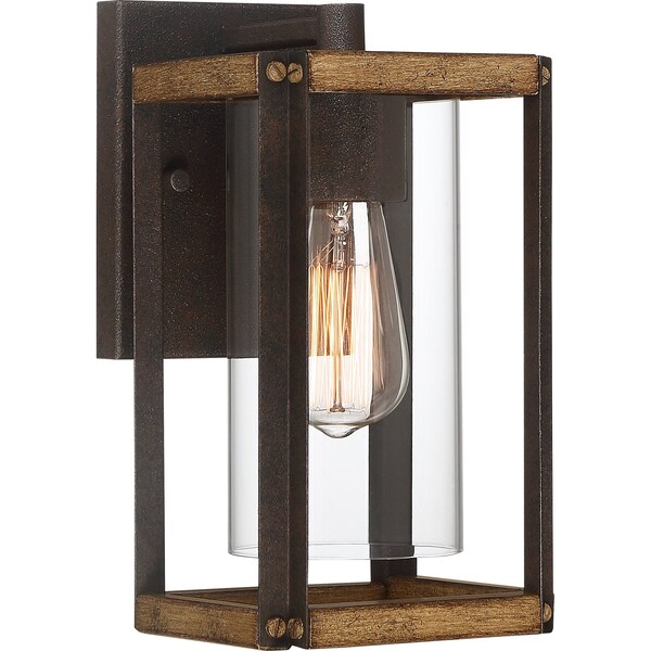 Create a welcoming look for you and your guests with the Marion Square collection. The rectangular silhouette is finished in Rustic Black and complemented by a painted Aged Walnut Wood for a transitional yet rustic style fixture. The open steel frame highlights the clear glass cylindrical shade and evokes a bright light within your home's exterior.
