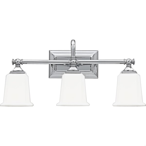 This gleaming collection gives a solid nod to mid century style. The squared shape of the opal etched glass shades gives this design an edge and it is complemented beautifully by the rectangular backplate.