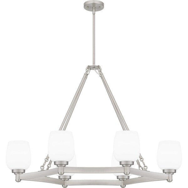 A fresh interpretation of the classic wagon wheel silhouette, Penning features opal etched glass shades that softly cast light. Whether in brushed nickel or matte black, the Penning chandelier delivers on updated traditional style. Hang this chandelier or island light in a foyer, formal dining room or kitchen for timeless style.