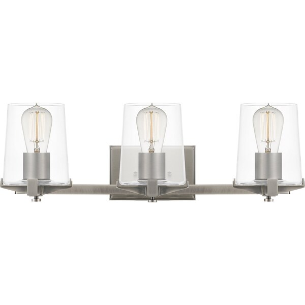 Add transitional flair to your home with Perry bath lights. Clean lines and clear glass shades create a simplistic silhouette, making Perry perfect for any industrial or modern farmhouse setting. Choose from two or three lights in either Weathered Brass or Antique Nickel or to upgrade your bathroom lighting today.
