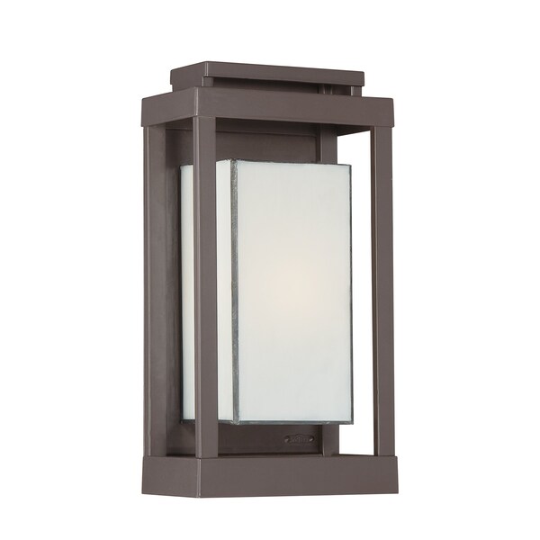 Enhance the exterior of your home with this unique and unadorned Powell collection. The shadowbox is striking in a western bronze finish and is contrasted beautifully by the rectangular white art glass.