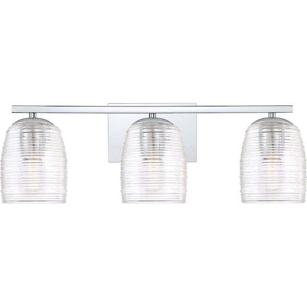 With stunning attention to detail, the Realm is a contemporary delight. The ribbed detailing on the clear spun glass shades provides texture while subtly disguising the bulbs. The support bar and backplate feature clean lines and a sleek polished chrome finish.