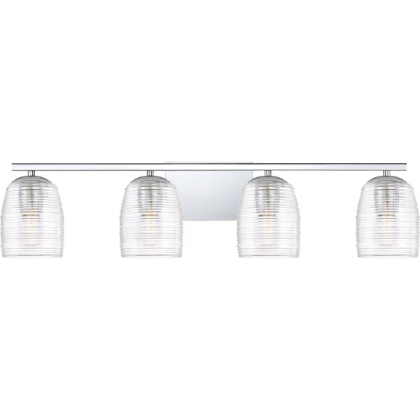 With stunning attention to detail, the Realm is a contemporary delight. The ribbed detailing on the clear spun glass shades provides texture while subtly disguising the bulbs. The support bar and backplate feature clean lines and a sleek polished chrome finish.