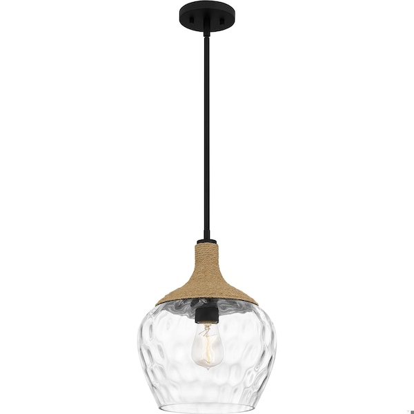 Part of the Quoizel Naturals series, the Royer one-light pendant exemplifies modern bohemian style. Rope detailing surrounding the top of the glass globe shade calls to mind coastal elements. Choose from either clear water glass or opal etched glass – both finished in a handsome matte black.