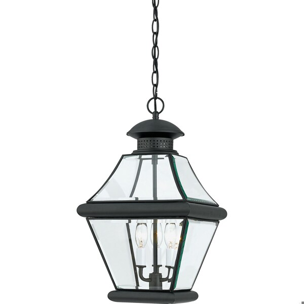 This outdoor lantern expresses simplicity of design. Clear beveled glass provides an unobstructed path for light to brighten your outdoor landscape. A deep mystic black finish completes the look.