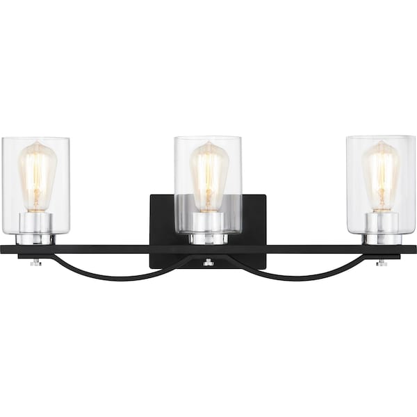 Salem features clear glass shades and a handsome silhouette. A rectangular backplate is accentuated by a graceful curved arm and industrial style knob details. Choose from a two, three, or four light bath and vanity light - all finished in a timeless Matte Black.