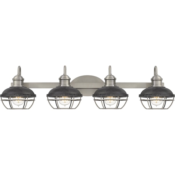 The industrial style of the Sandpiper collection will instantly elevate your bathroom. This fixture is finished in an Antique Polished Nickel and complemented with Distressed Iron. The metal cage shades add an interesting design element without sacrificing light. All Sandpiper bath fixtures can be mounted as uplights or downlights.
