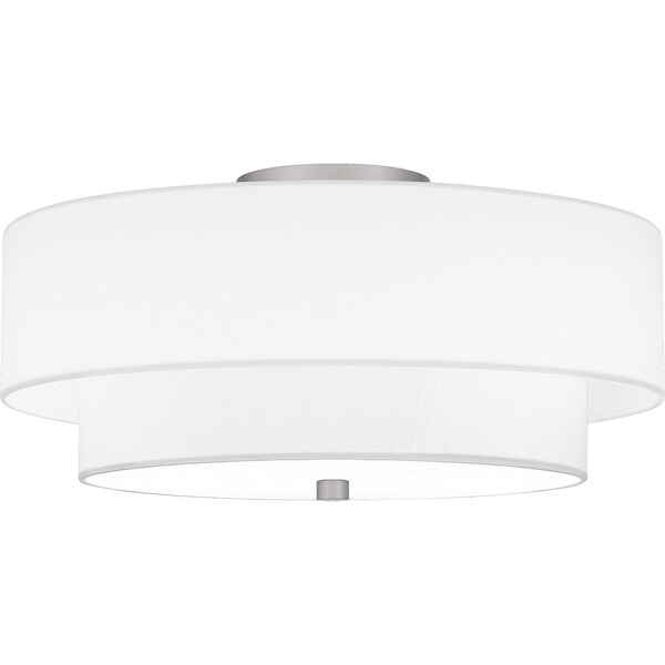Prewett's understated style provides a soft transitional look for most any room. The white fabric shade diffuses the light evenly, illuminating your home with a warm ambiance. Finished in brushed nickel, the Prewett semi-flush mount is a stylish choice in any foyer, hallway, bathroom, or home office.