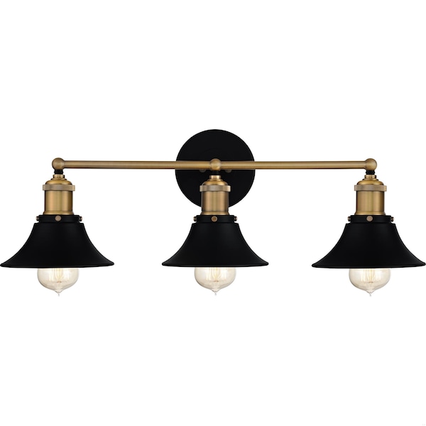 Anglophiles will love the Trafalgar bath light, bringing the London look to a primary or guest bath. Pairing bold matte black with warm, brass-tone elements, this light features a shapely shade and slightly exposed bulbs. The shade’s white interior is a clever design detail that helps maximize light.