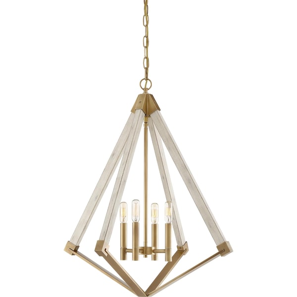 The bold lines and vintage finishes of the Viewpoint are a match made in design heaven! The inverted diamond silhouette features a faux wood frame in a whitewashed finish that is complemented by the soft brass hue of the accent caps and center column. Elongated candle sleeves and filament bulbs top off this splendidly charming collection.