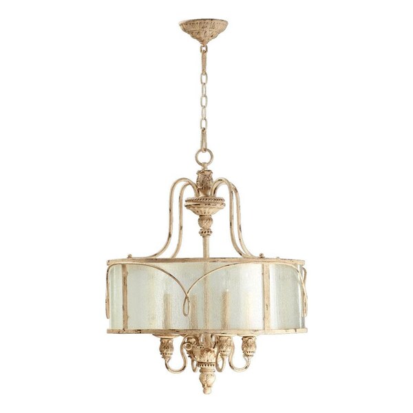 This Four Light Drum Shade Pendant is part of the Salento Collection and has Clear Seeded Glass and a Persian White Finish. It is Dry Rated.
