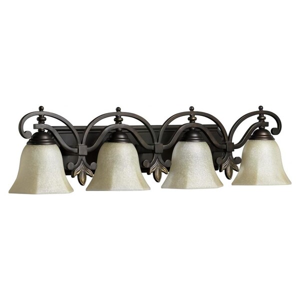 This Four Light Vanity is part of the Marcela Collection and has an Oiled Bronze Finish and Amber Scavo Glass. It is Damp Rated.
