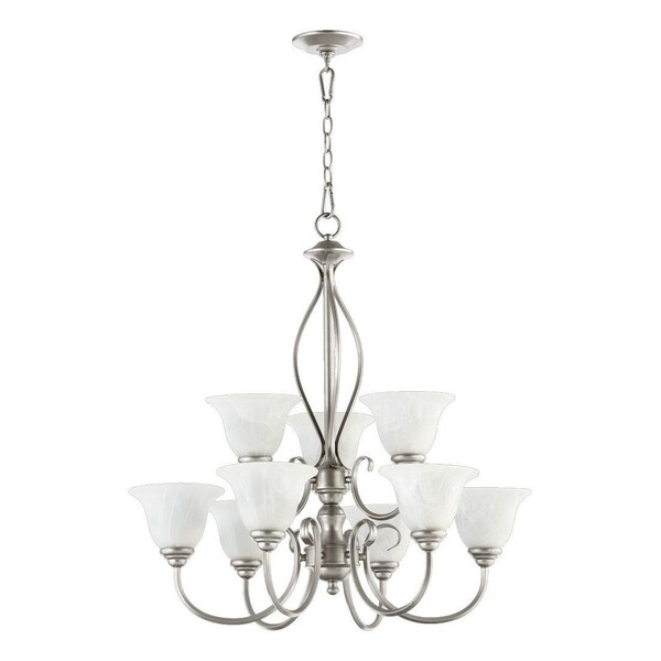 This Nine Light Up Chandelier is part of the Spencer Collection and has Amber Scavo Glass and a Classic Nickel Finish. It is Dry Rated.