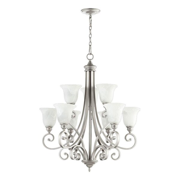 This Nine Light Up Chandelier is part of the Bryant Collection and has Faux Alabaster Glass and a Classic Nickel Finish. It is Dry Rated.