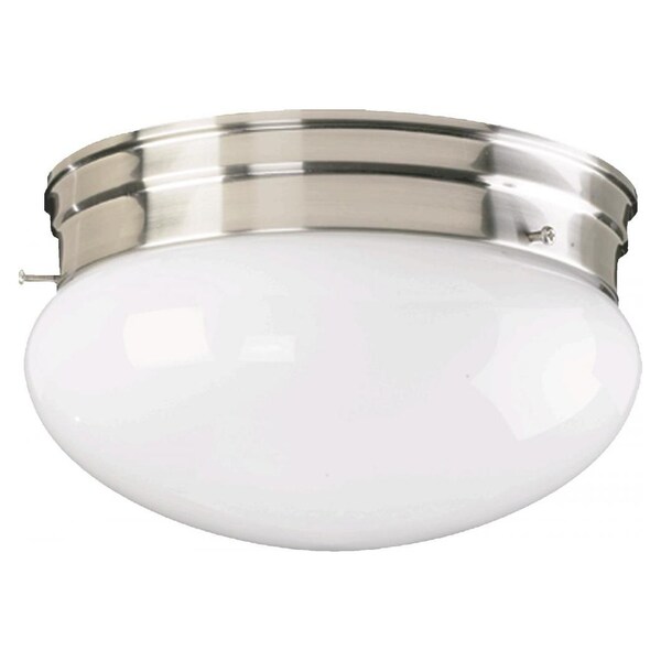 This One Light Mushroom Flush Mount has a Satin Nickel Finish and Opal Glass. It is Damp Rated.