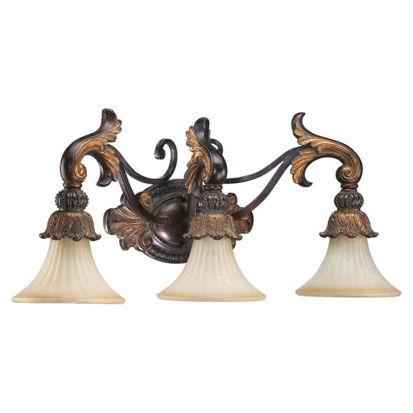 This Three Light Vanity is part of the Madeleine Collection and has a Corsican Gold Finish. It is Damp Rated.