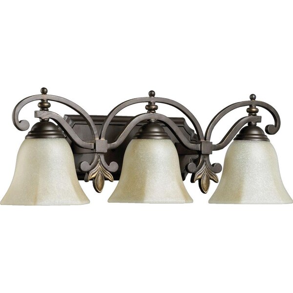 This Three Light Vanity is part of the Marcela Collection and has an Oiled Bronze Finish and Amber Scavo Glass. It is Damp Rated.