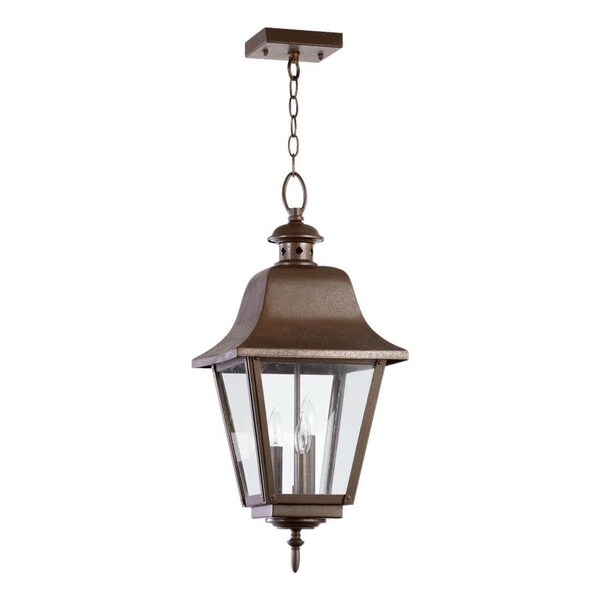 This Three Light Hanging Lantern is part of the Bishop Collection and has an Oiled Bronze Finish and Clear Glass. It is Outdoor Capable and Damp Rated.