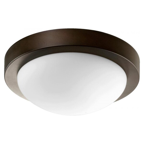 This Two Light Bowl Flush Mount has an Oiled Bronze Finish and Opal Glass. It is Energy Efficient and Damp Rated.