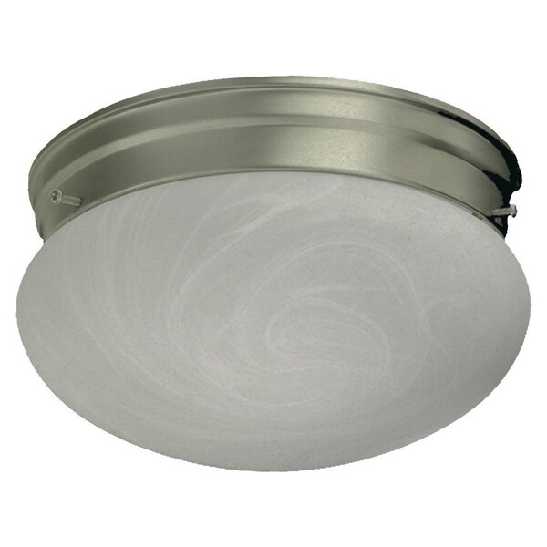 This Two Light Mushroom Flush Mount has a Satin Nickel Finish. It is Damp Rated.