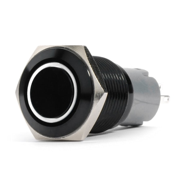 Finished in a seductive black these 19mm Race Sport Lighting flush mount switches can be used in two unique ways, Light press for momentary action, Full press latches on. They also included a led indicator light as well. Single pole double throw Push Button ON/OFF switch with LED indicator With Common, NO, NC and LED solder lug connections.